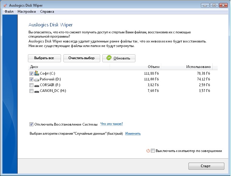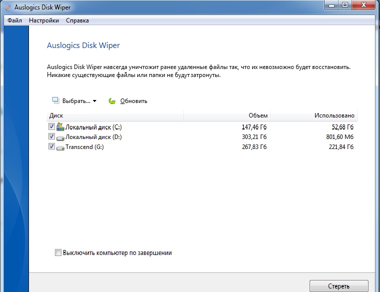 3. После выделения галочками нужных дисков, мы должны нажать кнопку «Стереть». Воспринимается как «Стереть содержимое дисков»! Кнопку надо переименовать в «Старт» (варианты: «Стереть удаленные файлы», «Очистить»).